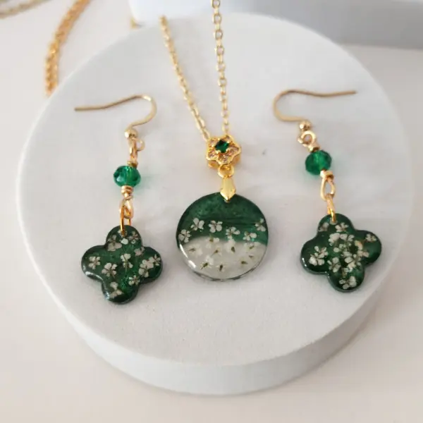 The handmade resin jewelry set captures the calm beauty of nature with real dried flowers preserved in crystal-clear resin. With deep green tones, golden accents, and lightweight comfort, this set is both graceful and timeless.